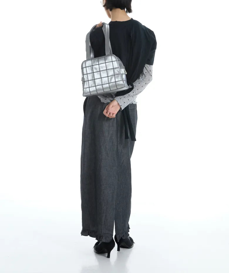 Crafted from a unique metallic sheen fabric, this bag combines a soft, lightweight texture with subtle creases that reflect a cool, iridescent quality from different angles. The innovative material not only catches the eye but also offers a distinctive tactile experience.